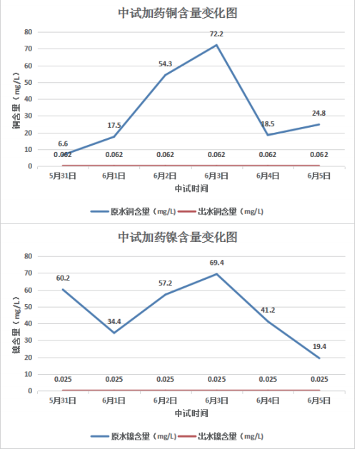 1.在投加破絡劑總量為850kg,重金屬捕捉劑總量為100kg時,出水總銅穩定在0.062mg/L,總鎳穩定在0.025mg/L,達到排放標準。