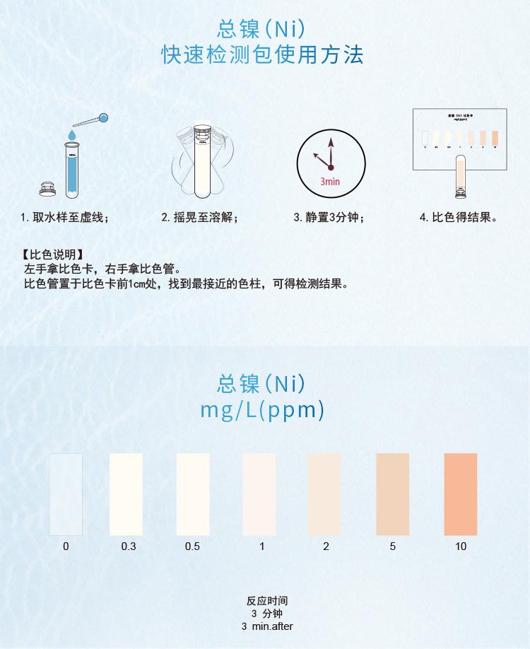 2.本產(chǎn)品檢測水中鎳離子(Ni2+)含量在0-5mg/L(ppm)范圍內(nèi),濃度過高會產(chǎn)生紅色沉淀而影響比色,若要檢測5mg/L以上濃度水樣,請預先稀釋水樣后再進行測定,具體操作見稀釋說明書。