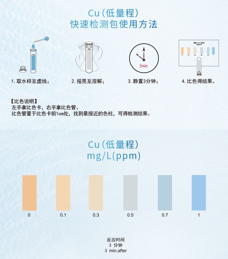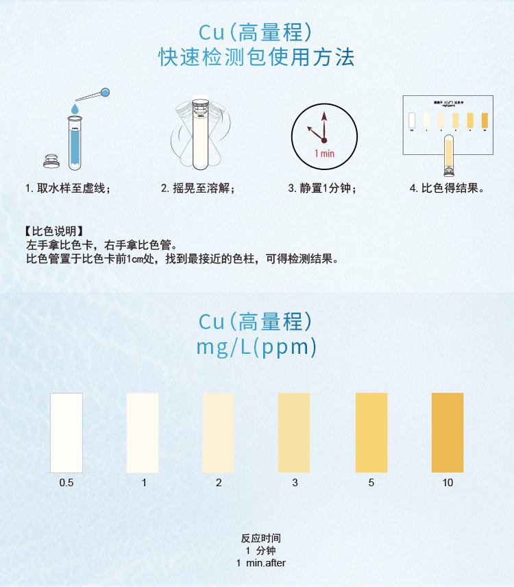 2.本產(chǎn)品檢測水中銅離子(Cu2+)含量在0.5-10mg/L(ppm)范圍內(nèi),濃度過高會產(chǎn)生黃棕色沉淀而影響比色,若要檢測10mg/L以上濃度水樣,請預先稀釋水樣后再進行測定,具體操作見稀釋說明書。